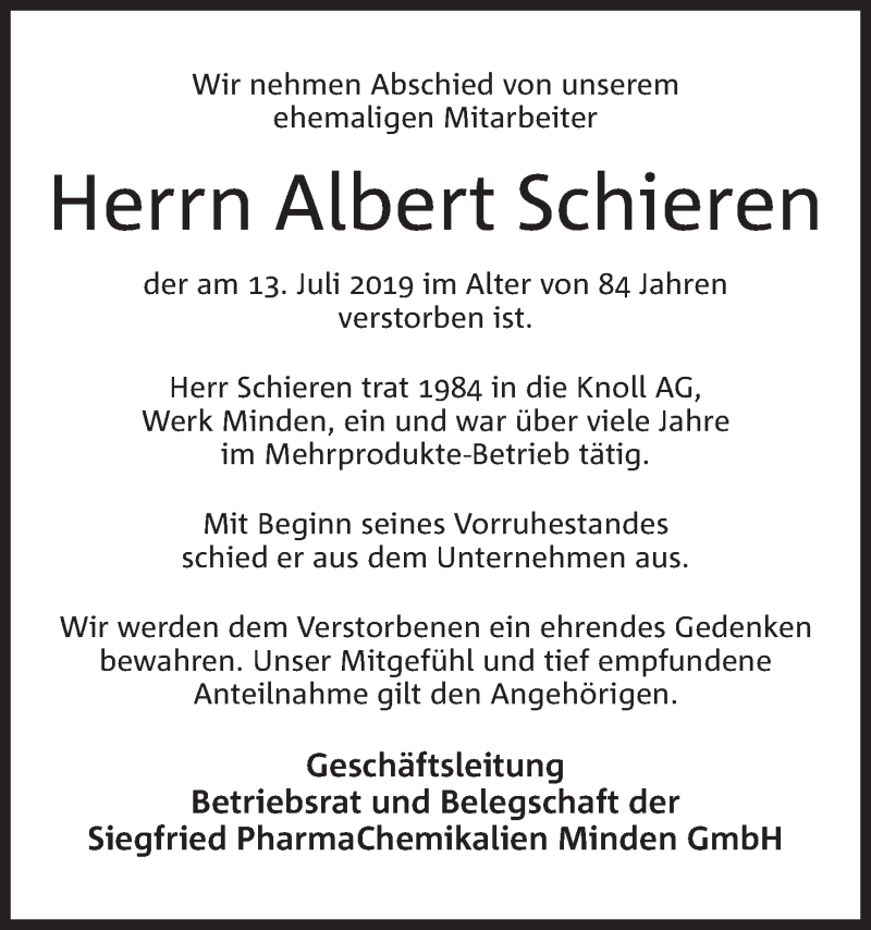 Hier finden Sie alle Traueranzeigen aus der Zeitung, die bisher für Albert Schieren erschienen sind. Weitere Traueranzeigen, die in der Zeitung erscheinen, werden hier ebenfalls aufgelistet