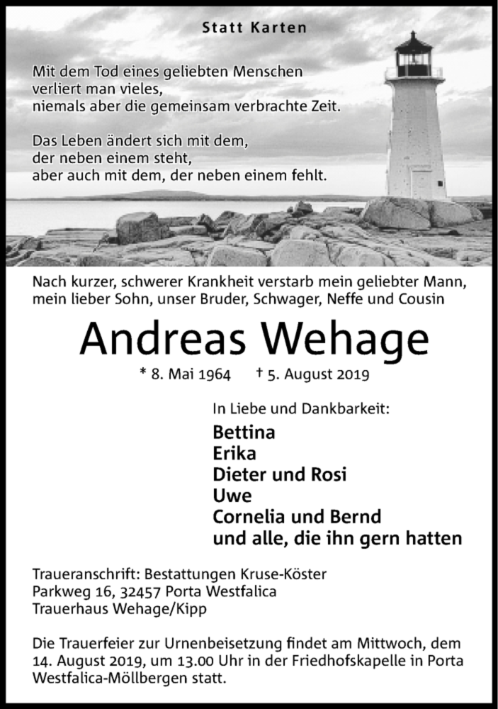 Hier finden Sie alle Traueranzeigen aus der Zeitung, die bisher für Andreas Wehage erschienen sind. Weitere Traueranzeigen, die in der Zeitung erscheinen, werden hier ebenfalls aufgelistet