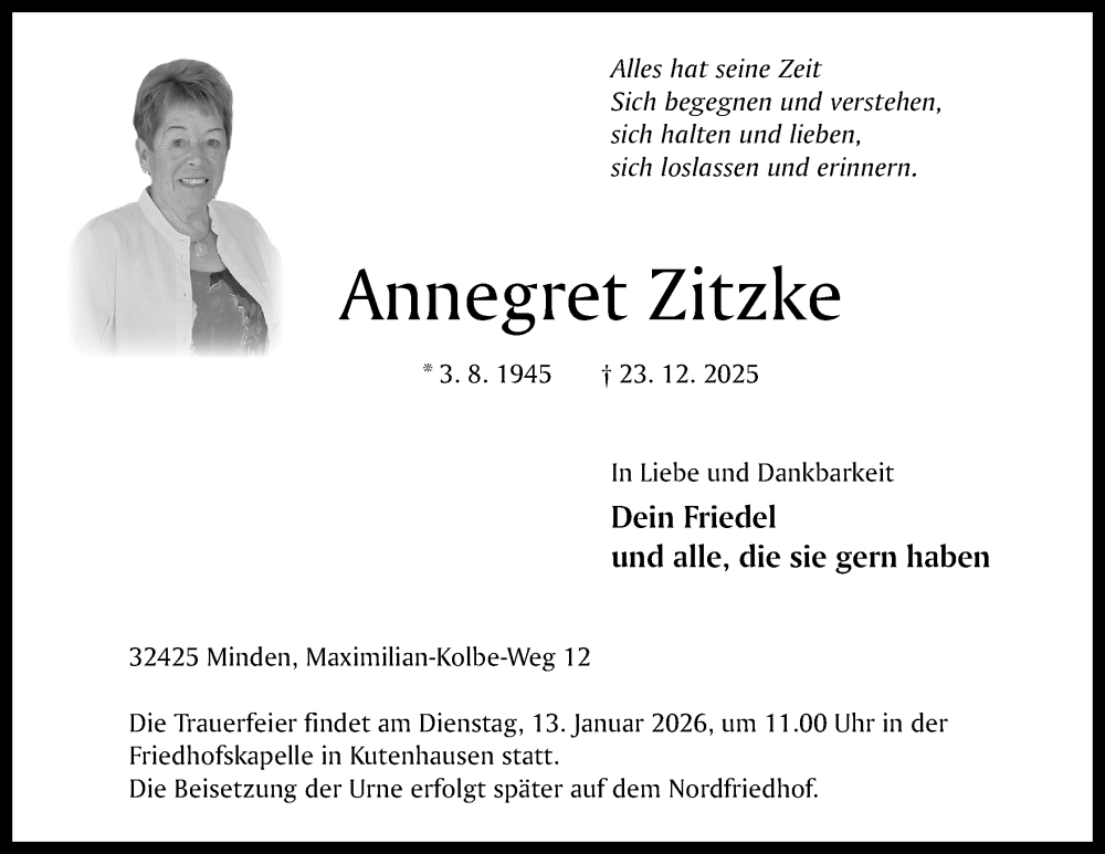 Hier finden Sie alle Traueranzeigen aus der Zeitung, die bisher für Annegret Zitzke erschienen sind. Weitere Traueranzeigen, die in der Zeitung erscheinen, werden hier ebenfalls aufgelistet