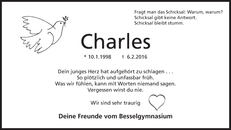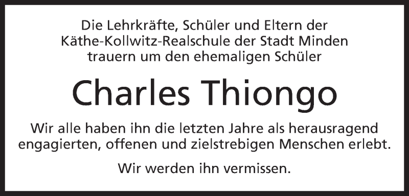 Hier finden Sie alle Traueranzeigen aus der Zeitung, die bisher für Charles Thiongo erschienen sind. Weitere Traueranzeigen, die in der Zeitung erscheinen, werden hier ebenfalls aufgelistet