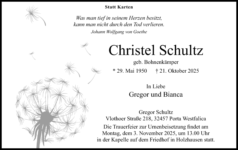 Hier finden Sie alle Traueranzeigen aus der Zeitung, die bisher für Christel Schultz erschienen sind. Weitere Traueranzeigen, die in der Zeitung erscheinen, werden hier ebenfalls aufgelistet