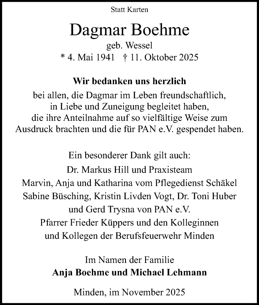 Hier finden Sie alle Traueranzeigen aus der Zeitung, die bisher für Dagmar Boehme erschienen sind. Weitere Traueranzeigen, die in der Zeitung erscheinen, werden hier ebenfalls aufgelistet