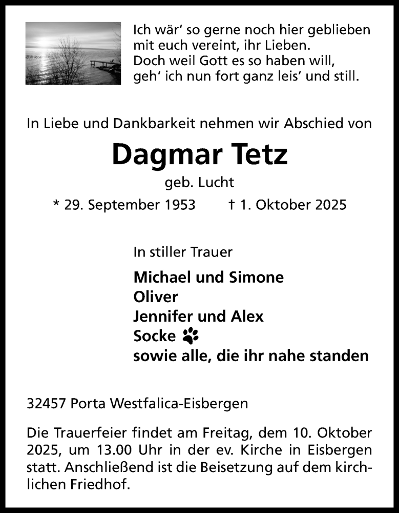Hier finden Sie alle Traueranzeigen aus der Zeitung, die bisher für Dagmar Tetz erschienen sind. Weitere Traueranzeigen, die in der Zeitung erscheinen, werden hier ebenfalls aufgelistet