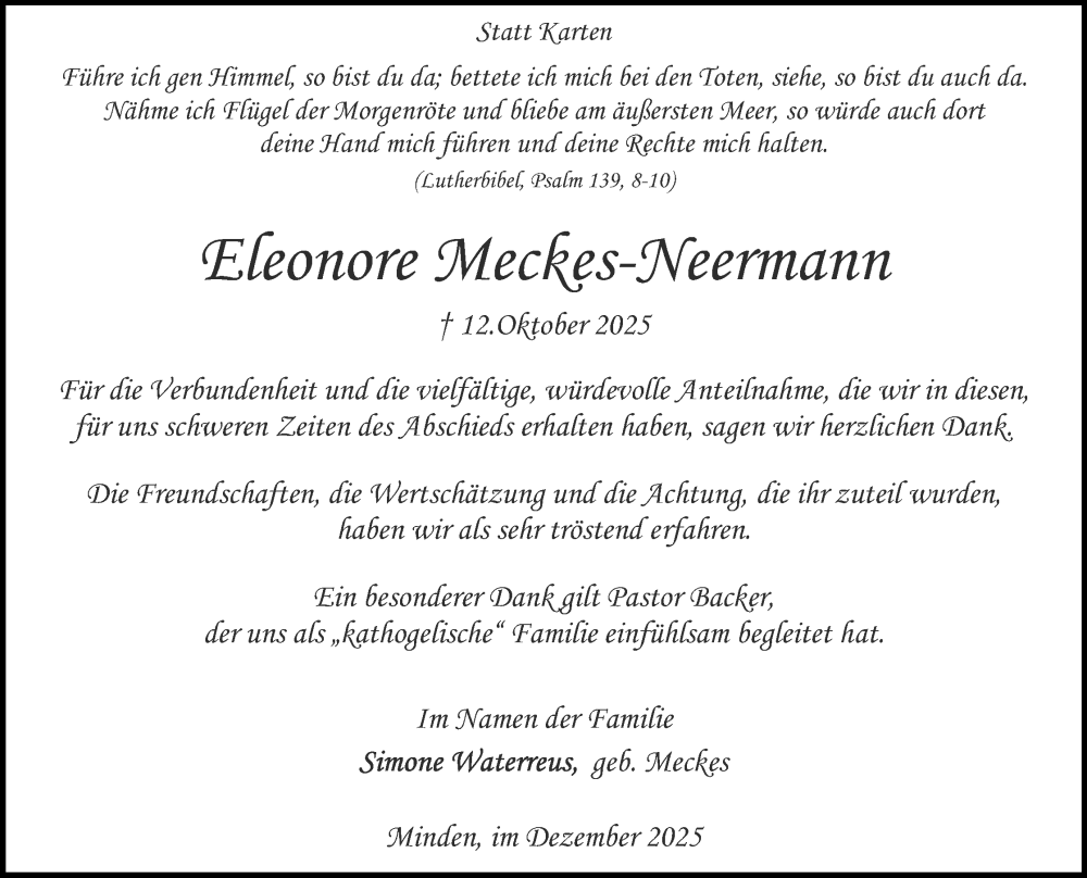 Hier finden Sie alle Traueranzeigen aus der Zeitung, die bisher für Eleonore Meckes-Neermann erschienen sind. Weitere Traueranzeigen, die in der Zeitung erscheinen, werden hier ebenfalls aufgelistet