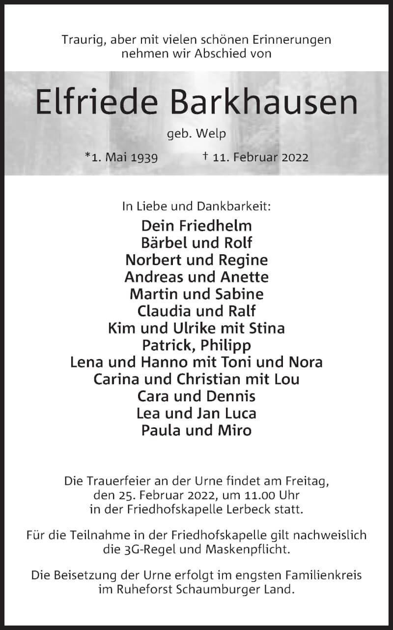 Hier finden Sie alle Traueranzeigen aus der Zeitung, die bisher für Elfriede Barkhausen erschienen sind. Weitere Traueranzeigen, die in der Zeitung erscheinen, werden hier ebenfalls aufgelistet