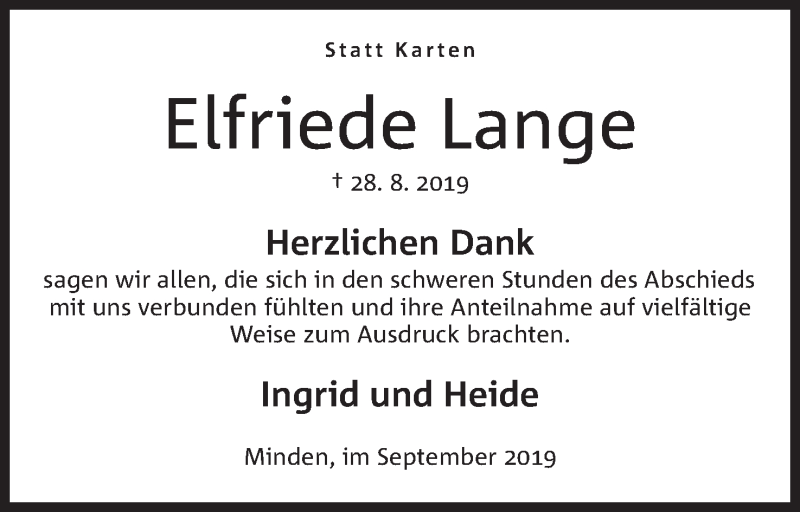 Hier finden Sie alle Traueranzeigen aus der Zeitung, die bisher für Elfriede Lange erschienen sind. Weitere Traueranzeigen, die in der Zeitung erscheinen, werden hier ebenfalls aufgelistet