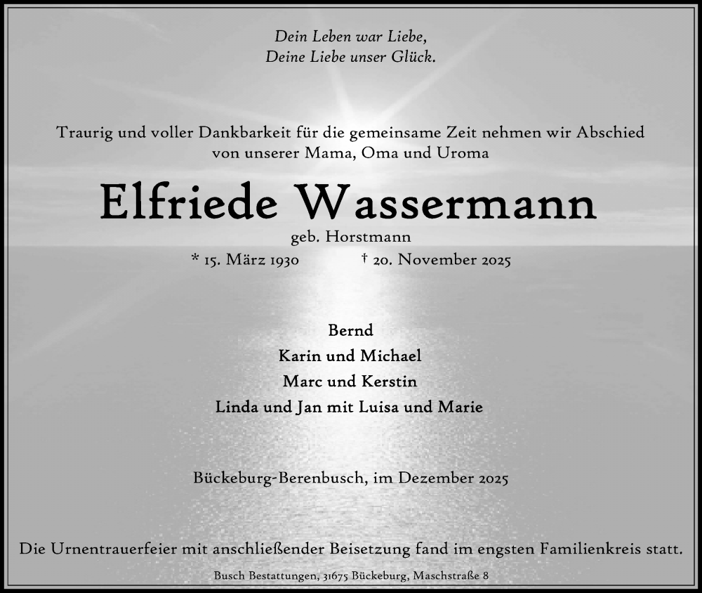 Hier finden Sie alle Traueranzeigen aus der Zeitung, die bisher für Elfriede Wassermann erschienen sind. Weitere Traueranzeigen, die in der Zeitung erscheinen, werden hier ebenfalls aufgelistet