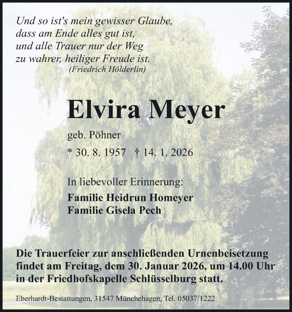 Hier finden Sie alle Traueranzeigen aus der Zeitung, die bisher für Elvira Meyer erschienen sind. Weitere Traueranzeigen, die in der Zeitung erscheinen, werden hier ebenfalls aufgelistet