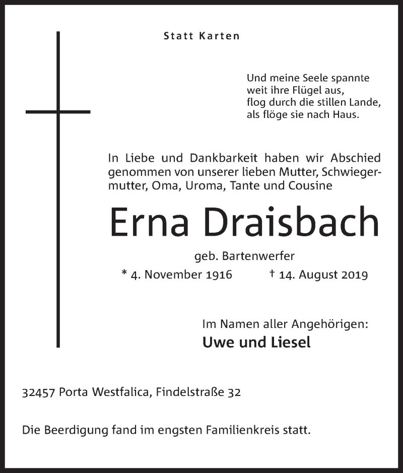 Hier finden Sie alle Traueranzeigen aus der Zeitung, die bisher für Erna Draisbach erschienen sind. Weitere Traueranzeigen, die in der Zeitung erscheinen, werden hier ebenfalls aufgelistet