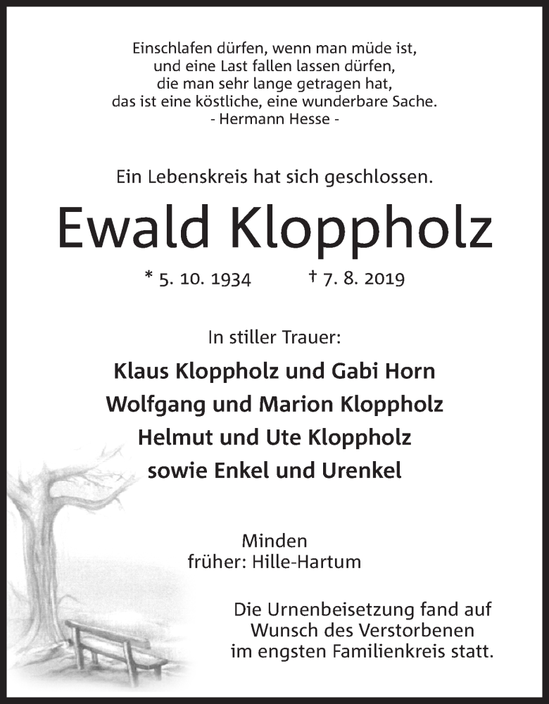 Hier finden Sie alle Traueranzeigen aus der Zeitung, die bisher für Ewald Kloppholz erschienen sind. Weitere Traueranzeigen, die in der Zeitung erscheinen, werden hier ebenfalls aufgelistet