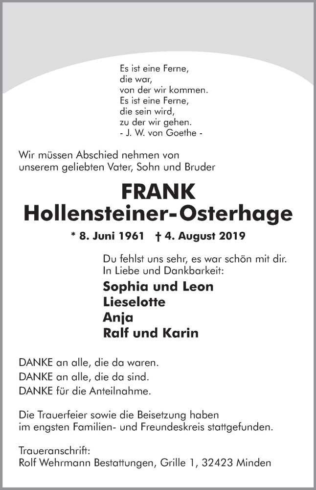 Hier finden Sie alle Traueranzeigen aus der Zeitung, die bisher für Frank Hollensteiner-Osterhage erschienen sind. Weitere Traueranzeigen, die in der Zeitung erscheinen, werden hier ebenfalls aufgelistet