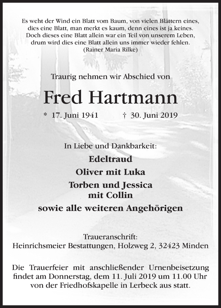 Hier finden Sie alle Traueranzeigen aus der Zeitung, die bisher für Fred Hartmann erschienen sind. Weitere Traueranzeigen, die in der Zeitung erscheinen, werden hier ebenfalls aufgelistet