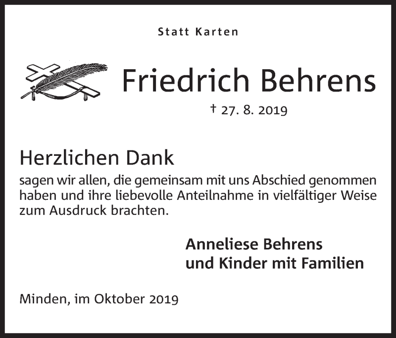 Hier finden Sie alle Traueranzeigen aus der Zeitung, die bisher für Friedrich Behrens erschienen sind. Weitere Traueranzeigen, die in der Zeitung erscheinen, werden hier ebenfalls aufgelistet
