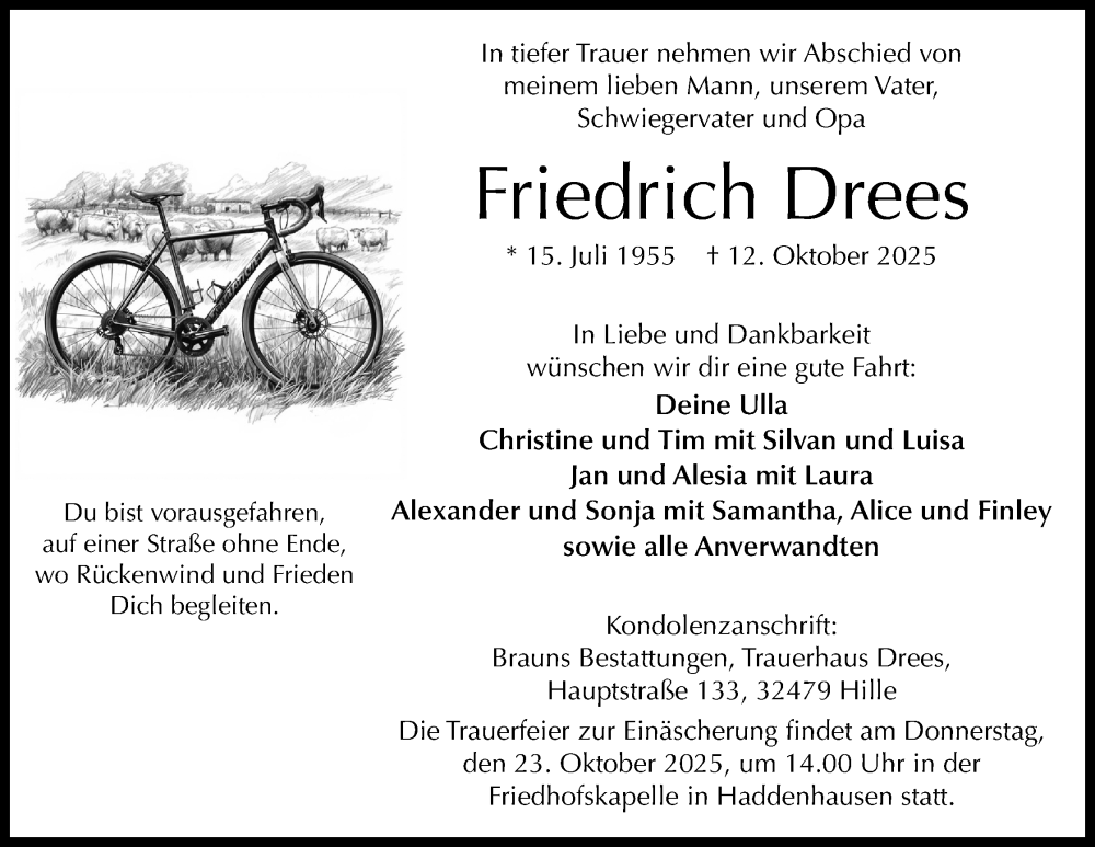 Hier finden Sie alle Traueranzeigen aus der Zeitung, die bisher für Friedrich Drees erschienen sind. Weitere Traueranzeigen, die in der Zeitung erscheinen, werden hier ebenfalls aufgelistet