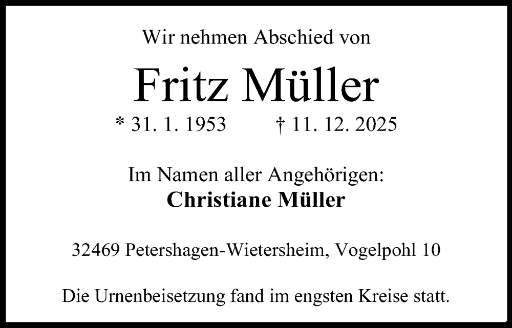 Hier finden Sie alle Traueranzeigen aus der Zeitung, die bisher für Fritz Müller erschienen sind. Weitere Traueranzeigen, die in der Zeitung erscheinen, werden hier ebenfalls aufgelistet