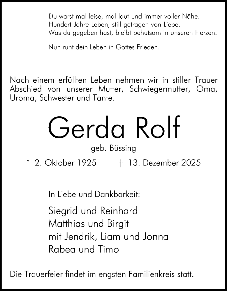 Hier finden Sie alle Traueranzeigen aus der Zeitung, die bisher für Gerda Rolf erschienen sind. Weitere Traueranzeigen, die in der Zeitung erscheinen, werden hier ebenfalls aufgelistet