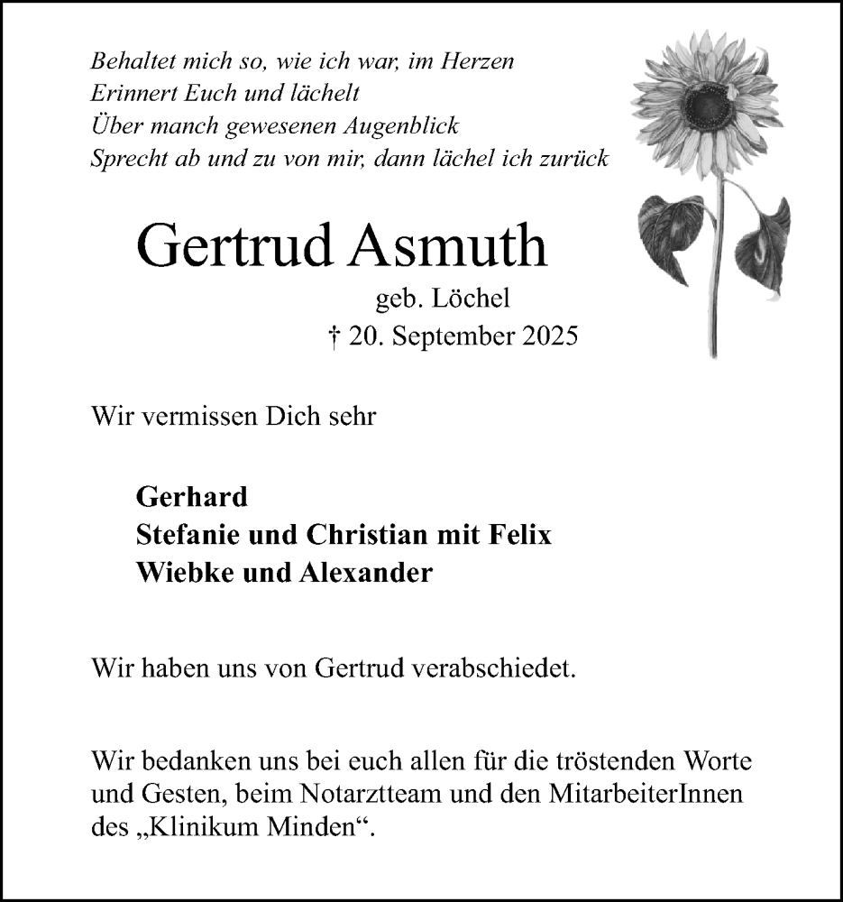 Hier finden Sie alle Traueranzeigen aus der Zeitung, die bisher für Gertrud Asmuth erschienen sind. Weitere Traueranzeigen, die in der Zeitung erscheinen, werden hier ebenfalls aufgelistet