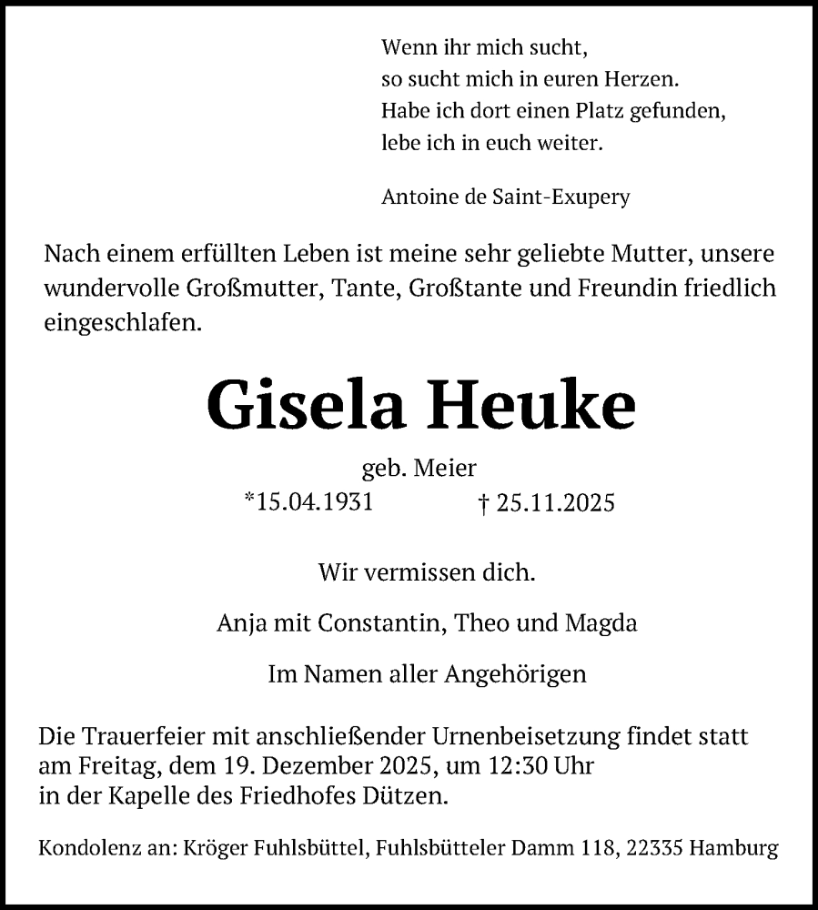Hier finden Sie alle Traueranzeigen aus der Zeitung, die bisher für Gisela Heuke erschienen sind. Weitere Traueranzeigen, die in der Zeitung erscheinen, werden hier ebenfalls aufgelistet