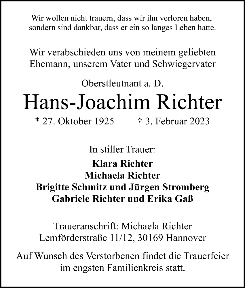 Hier finden Sie alle Traueranzeigen aus der Zeitung, die bisher für Hans-Joachim Richter erschienen sind. Weitere Traueranzeigen, die in der Zeitung erscheinen, werden hier ebenfalls aufgelistet