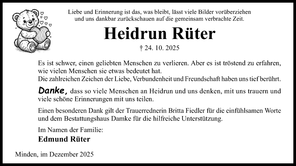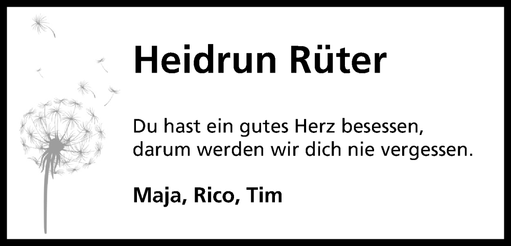 Hier finden Sie alle Traueranzeigen aus der Zeitung, die bisher für Heidrun Rüter erschienen sind. Weitere Traueranzeigen, die in der Zeitung erscheinen, werden hier ebenfalls aufgelistet