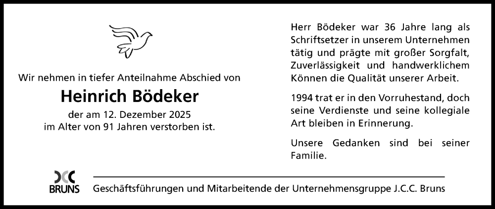 Hier finden Sie alle Traueranzeigen aus der Zeitung, die bisher für Heinrich Bödeker erschienen sind. Weitere Traueranzeigen, die in der Zeitung erscheinen, werden hier ebenfalls aufgelistet