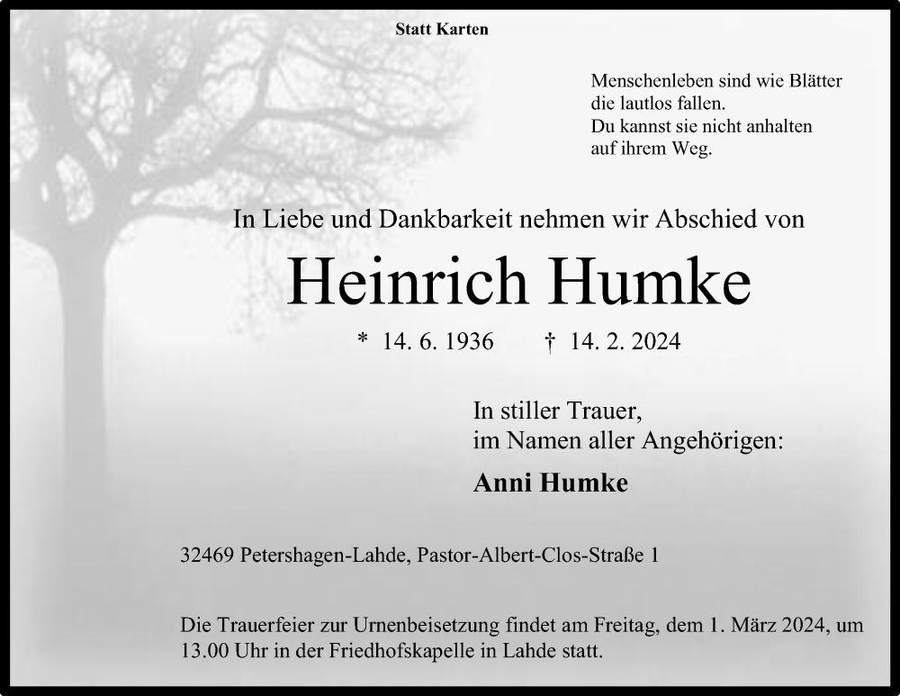 Hier finden Sie alle Traueranzeigen aus der Zeitung, die bisher für Heinrich Humke erschienen sind. Weitere Traueranzeigen, die in der Zeitung erscheinen, werden hier ebenfalls aufgelistet