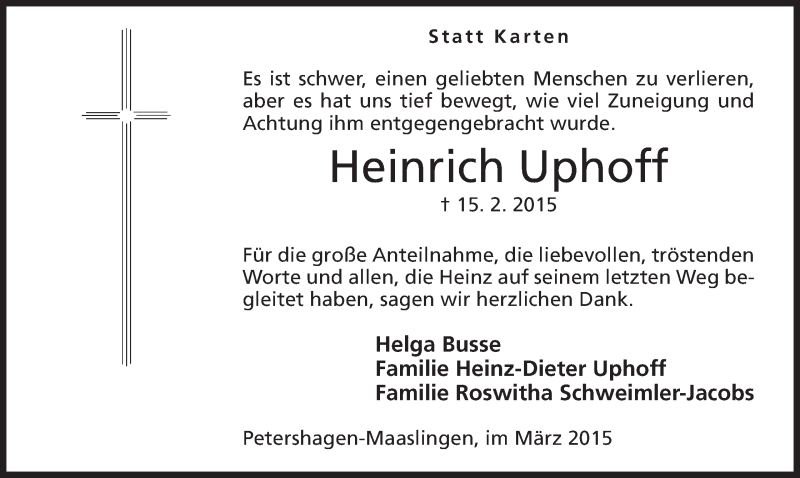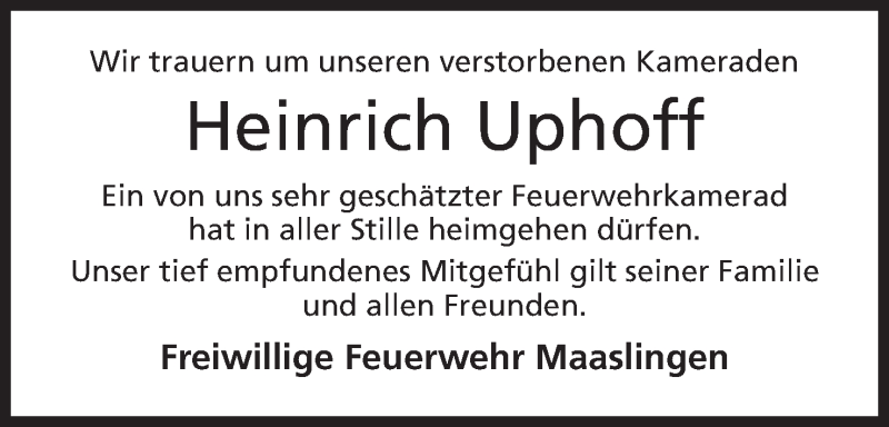 Hier finden Sie alle Traueranzeigen aus der Zeitung, die bisher für Heinrich Uphoff erschienen sind. Weitere Traueranzeigen, die in der Zeitung erscheinen, werden hier ebenfalls aufgelistet