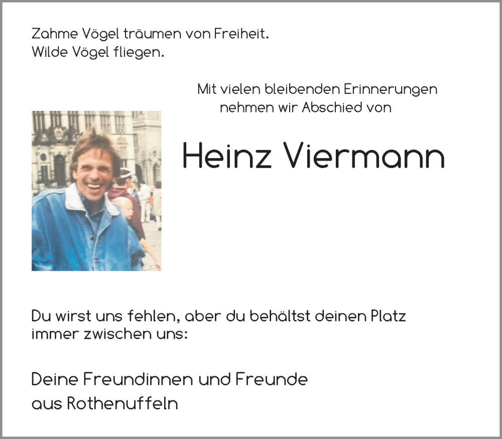 Hier finden Sie alle Traueranzeigen aus der Zeitung, die bisher für Heinz Viermann erschienen sind. Weitere Traueranzeigen, die in der Zeitung erscheinen, werden hier ebenfalls aufgelistet