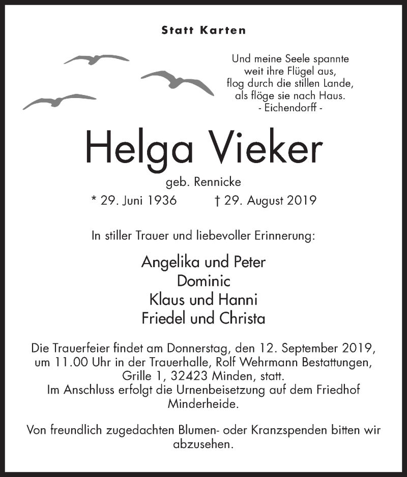 Hier finden Sie alle Traueranzeigen aus der Zeitung, die bisher für Helga Vieker erschienen sind. Weitere Traueranzeigen, die in der Zeitung erscheinen, werden hier ebenfalls aufgelistet