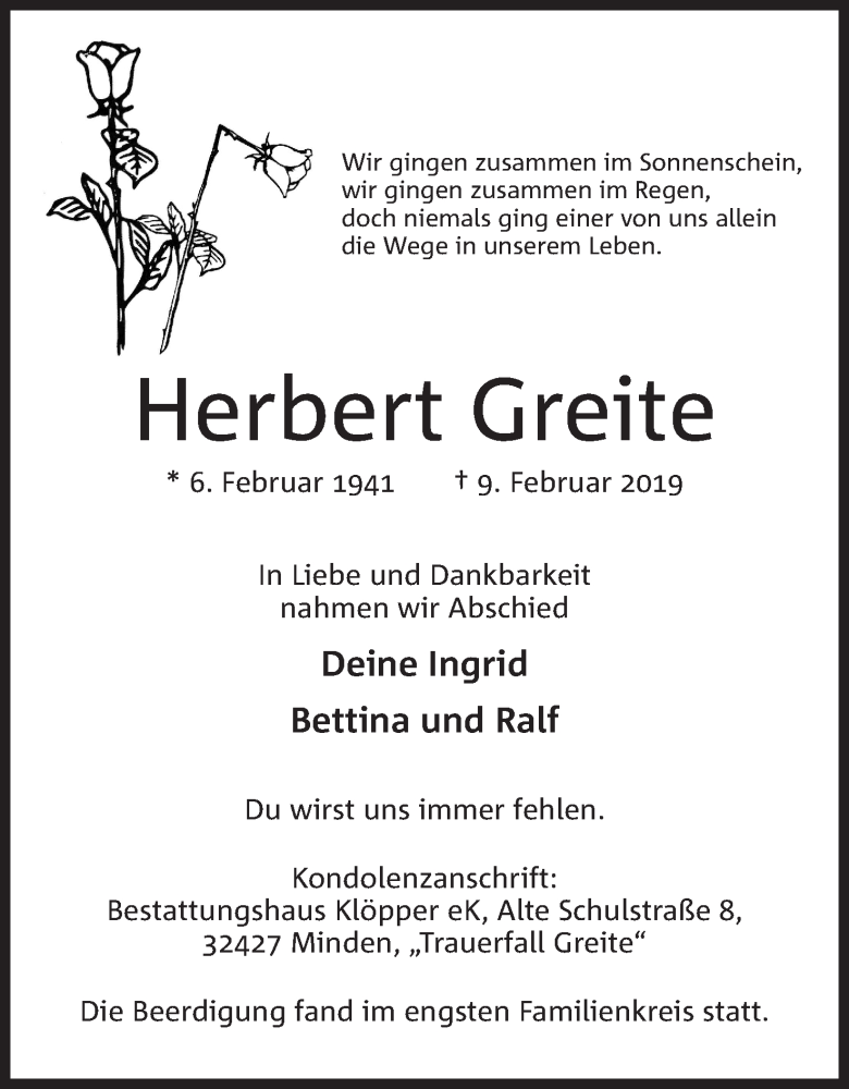 Hier finden Sie alle Traueranzeigen aus der Zeitung, die bisher für Herbert Greite erschienen sind. Weitere Traueranzeigen, die in der Zeitung erscheinen, werden hier ebenfalls aufgelistet