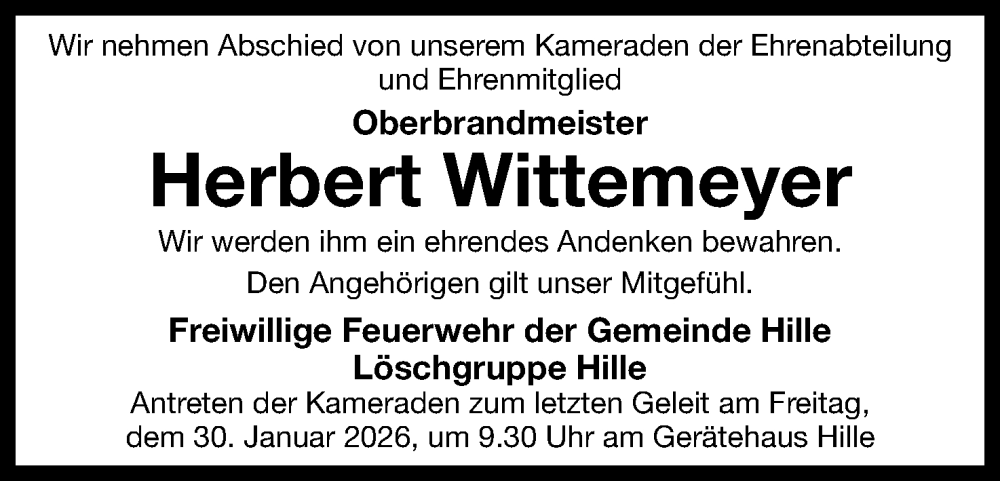 Hier finden Sie alle Traueranzeigen aus der Zeitung, die bisher für Herbert Wittemeyer erschienen sind. Weitere Traueranzeigen, die in der Zeitung erscheinen, werden hier ebenfalls aufgelistet