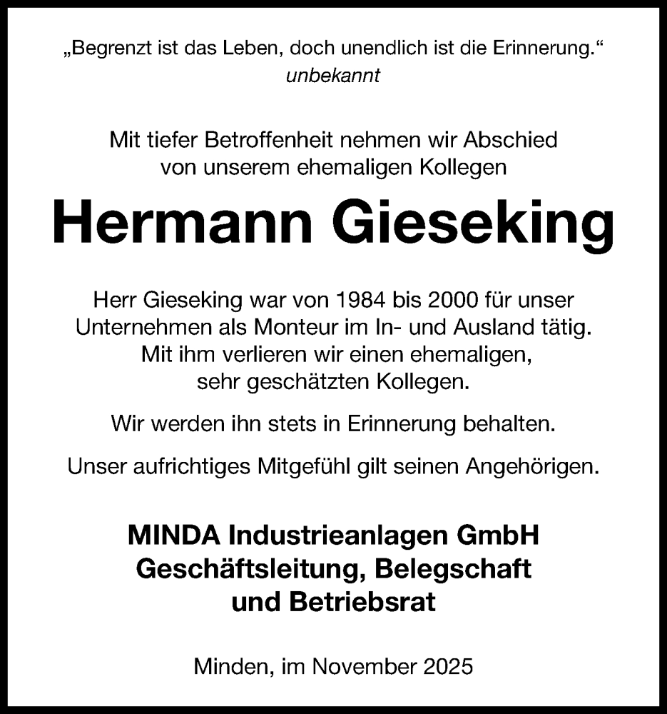 Hier finden Sie alle Traueranzeigen aus der Zeitung, die bisher für Hermann Gieseking erschienen sind. Weitere Traueranzeigen, die in der Zeitung erscheinen, werden hier ebenfalls aufgelistet
