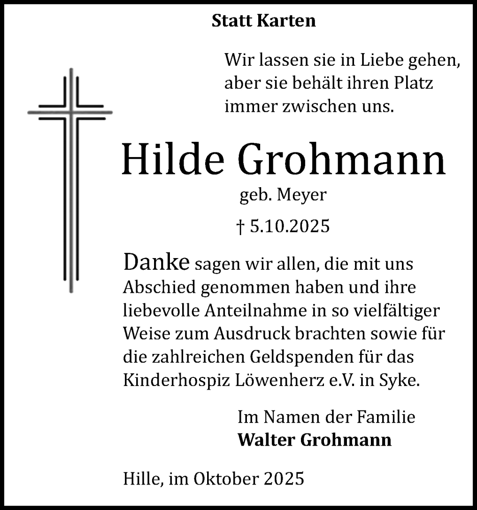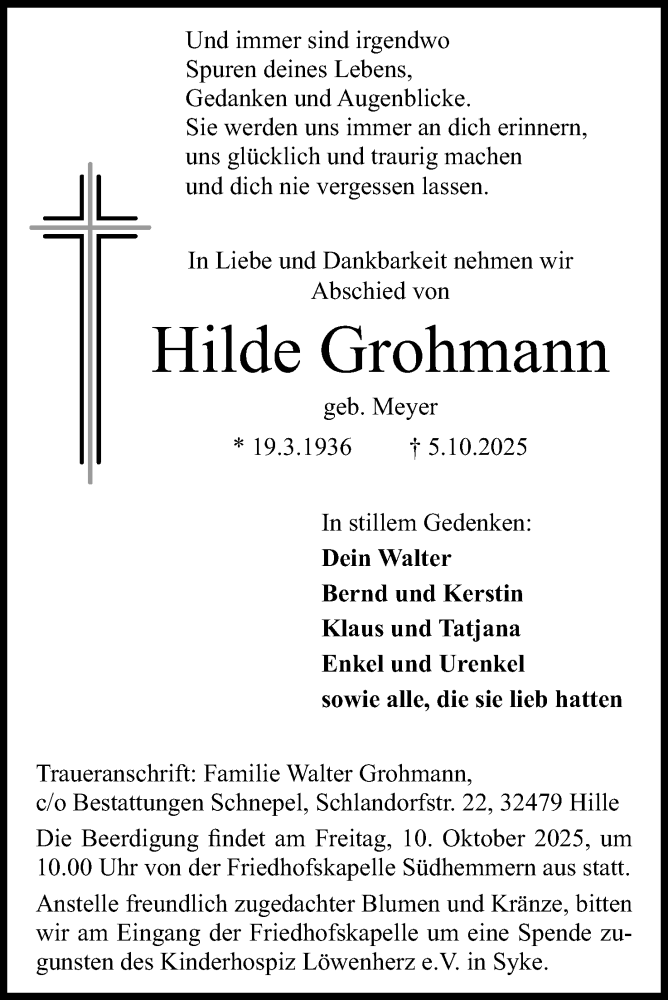 Hier finden Sie alle Traueranzeigen aus der Zeitung, die bisher für Hilde Grohmann erschienen sind. Weitere Traueranzeigen, die in der Zeitung erscheinen, werden hier ebenfalls aufgelistet