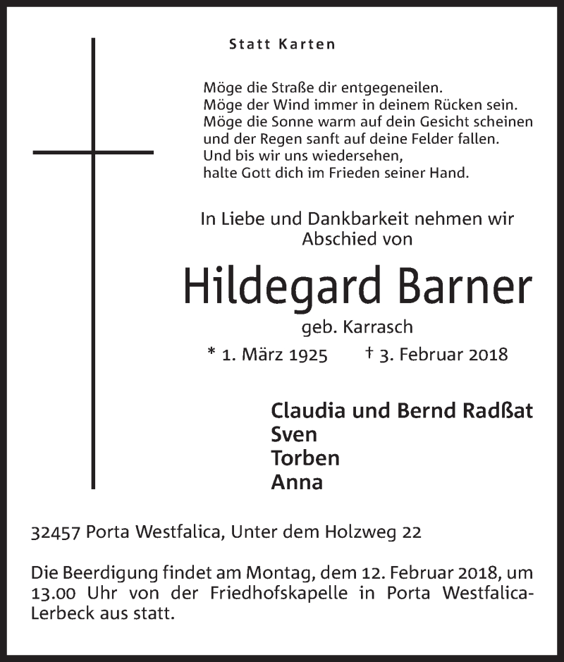 Hier finden Sie alle Traueranzeigen aus der Zeitung, die bisher für Hildegard Barner erschienen sind. Weitere Traueranzeigen, die in der Zeitung erscheinen, werden hier ebenfalls aufgelistet
