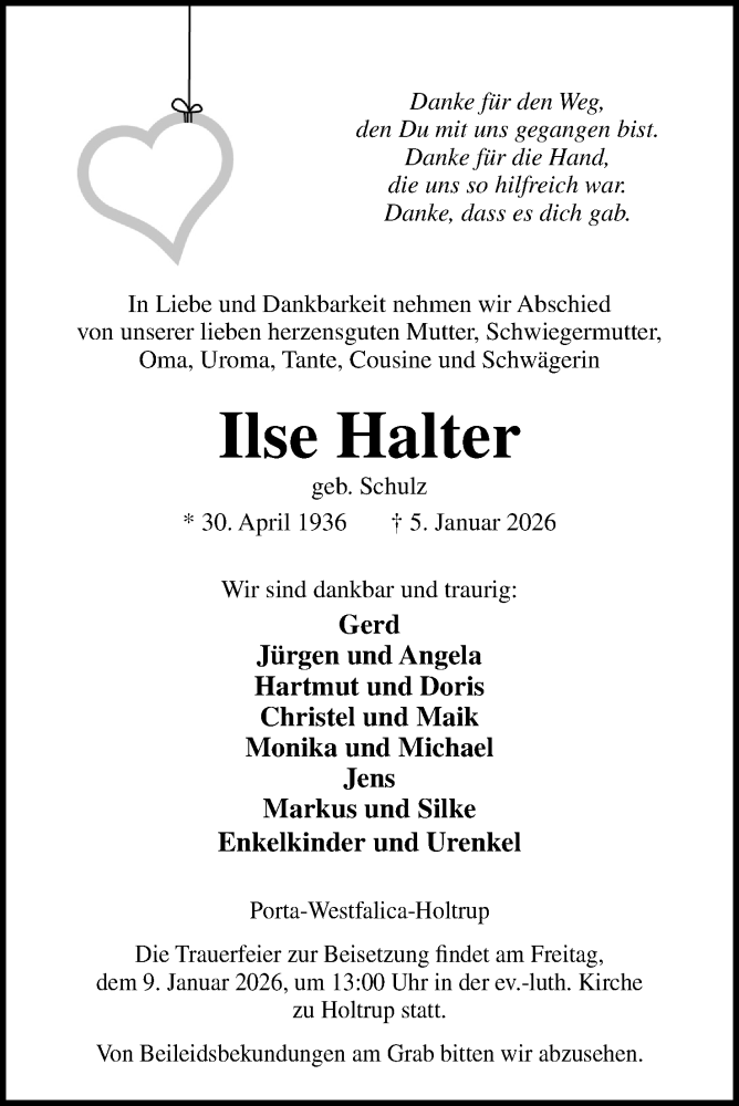 Hier finden Sie alle Traueranzeigen aus der Zeitung, die bisher für Ilse Halter erschienen sind. Weitere Traueranzeigen, die in der Zeitung erscheinen, werden hier ebenfalls aufgelistet