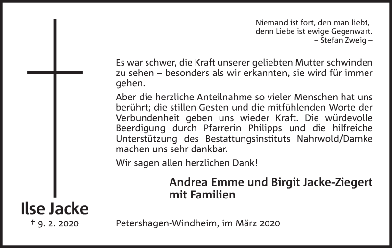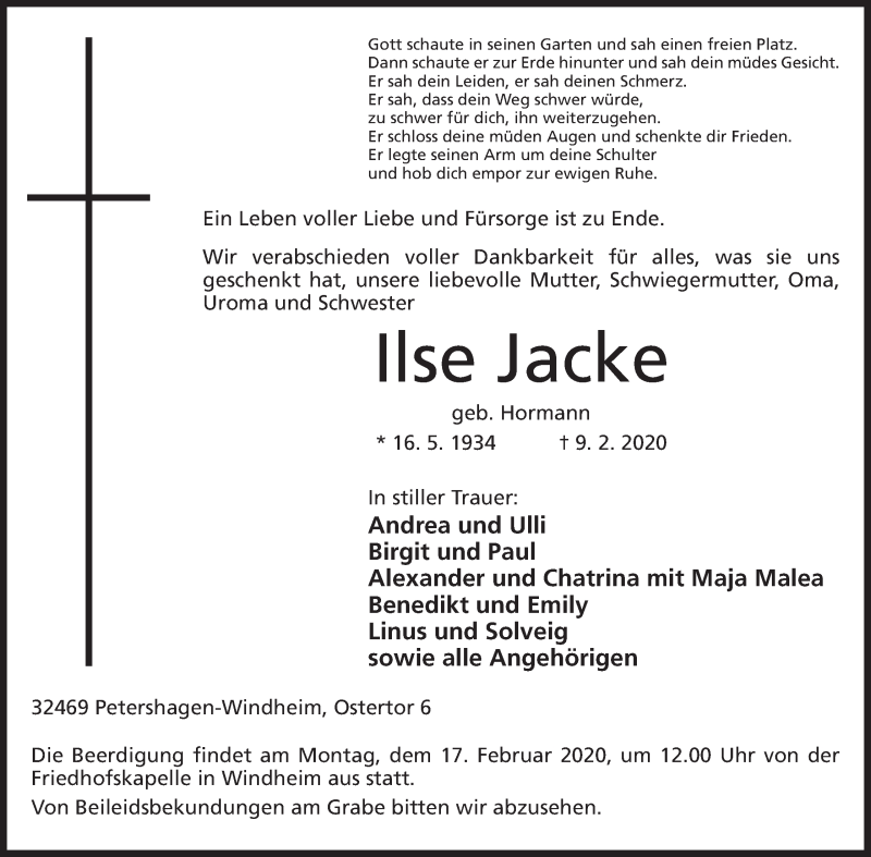 Hier finden Sie alle Traueranzeigen aus der Zeitung, die bisher für Ilse Jacke erschienen sind. Weitere Traueranzeigen, die in der Zeitung erscheinen, werden hier ebenfalls aufgelistet