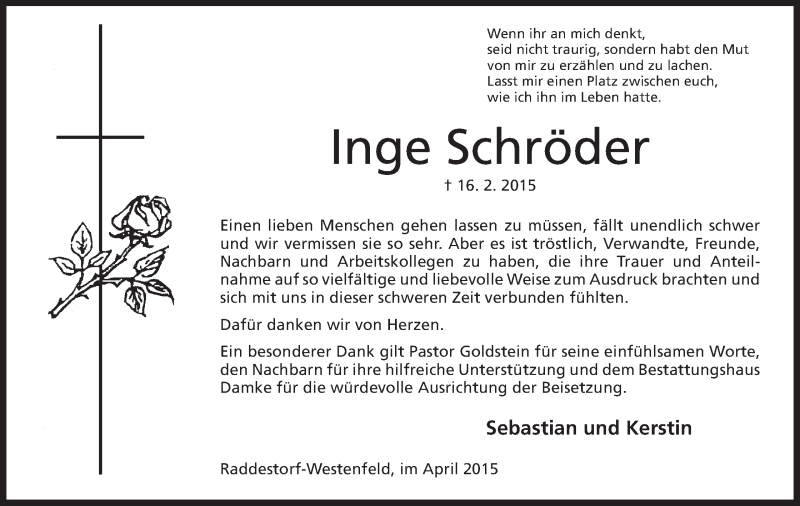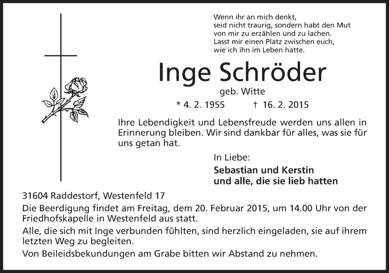 Hier finden Sie alle Traueranzeigen aus der Zeitung, die bisher für Inge Schröder erschienen sind. Weitere Traueranzeigen, die in der Zeitung erscheinen, werden hier ebenfalls aufgelistet