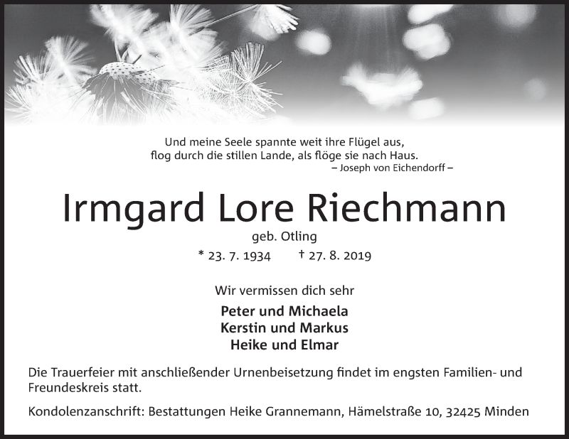Hier finden Sie alle Traueranzeigen aus der Zeitung, die bisher für Irmgard Lore Riechmann erschienen sind. Weitere Traueranzeigen, die in der Zeitung erscheinen, werden hier ebenfalls aufgelistet