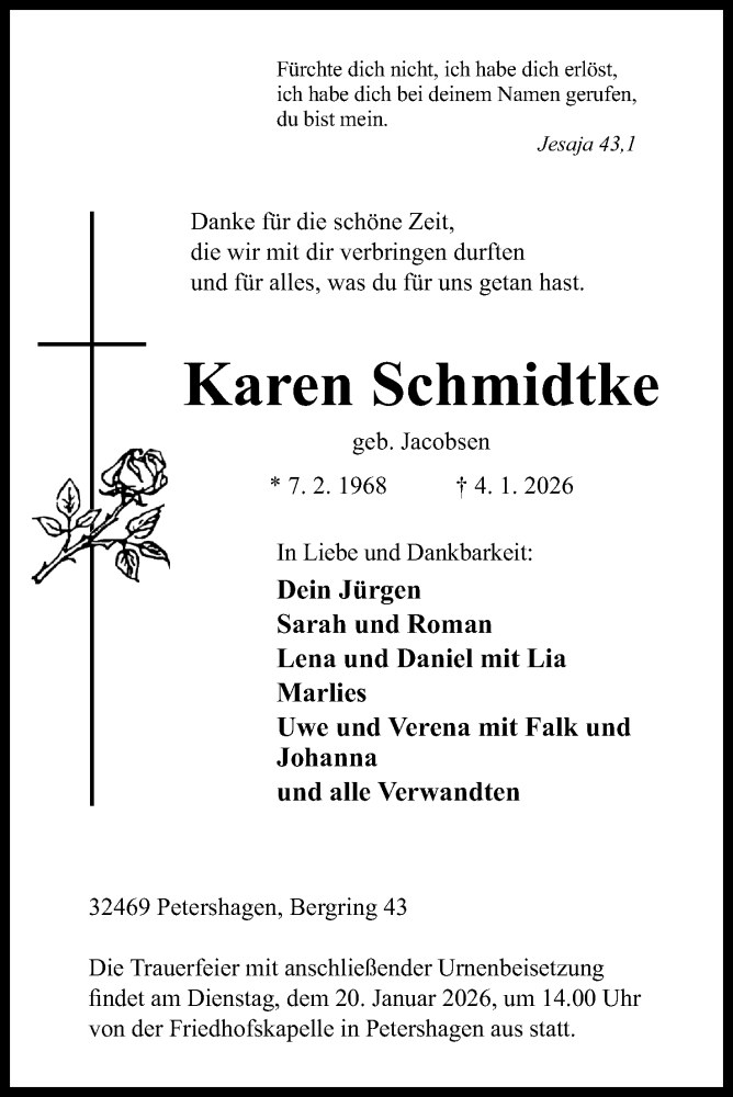 Hier finden Sie alle Traueranzeigen aus der Zeitung, die bisher für Karen Schmidtke erschienen sind. Weitere Traueranzeigen, die in der Zeitung erscheinen, werden hier ebenfalls aufgelistet