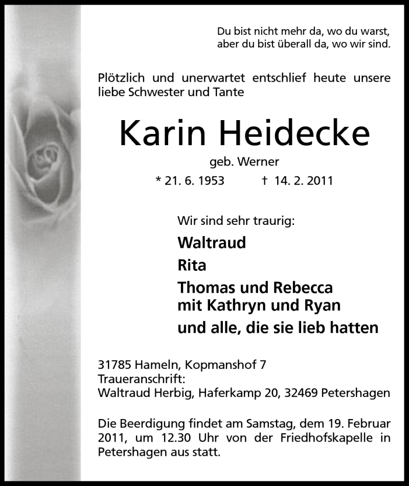 Hier finden Sie alle Traueranzeigen aus der Zeitung, die bisher für Karin Heidecke erschienen sind. Weitere Traueranzeigen, die in der Zeitung erscheinen, werden hier ebenfalls aufgelistet