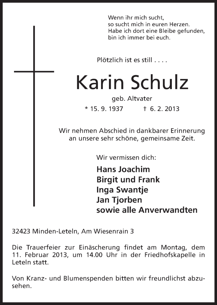 Hier finden Sie alle Traueranzeigen aus der Zeitung, die bisher für Karin Schulz erschienen sind. Weitere Traueranzeigen, die in der Zeitung erscheinen, werden hier ebenfalls aufgelistet
