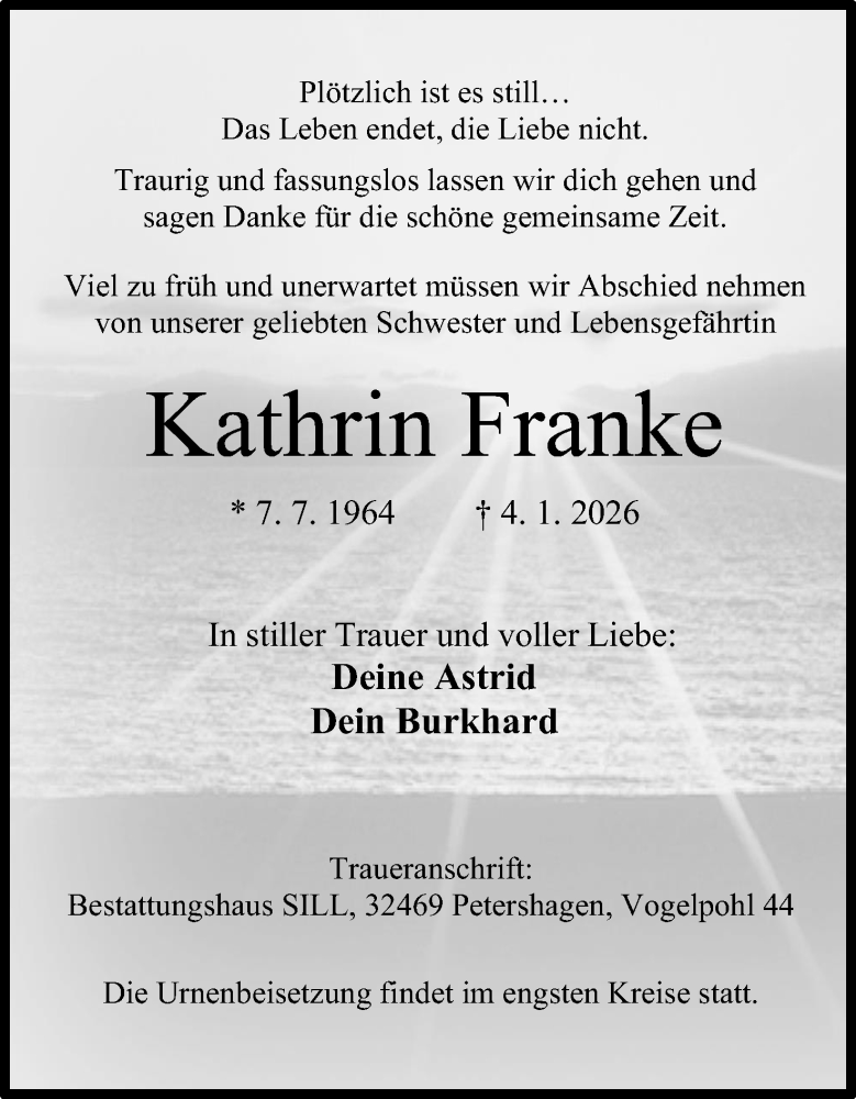 Hier finden Sie alle Traueranzeigen aus der Zeitung, die bisher für Kathrin Franke erschienen sind. Weitere Traueranzeigen, die in der Zeitung erscheinen, werden hier ebenfalls aufgelistet