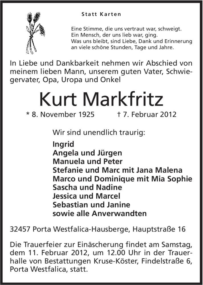 Hier finden Sie alle Traueranzeigen aus der Zeitung, die bisher für Kurt Markfritz erschienen sind. Weitere Traueranzeigen, die in der Zeitung erscheinen, werden hier ebenfalls aufgelistet