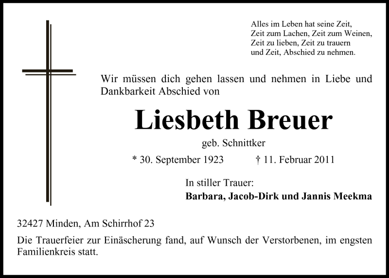Hier finden Sie alle Traueranzeigen aus der Zeitung, die bisher für Liesbeth Breuer erschienen sind. Weitere Traueranzeigen, die in der Zeitung erscheinen, werden hier ebenfalls aufgelistet