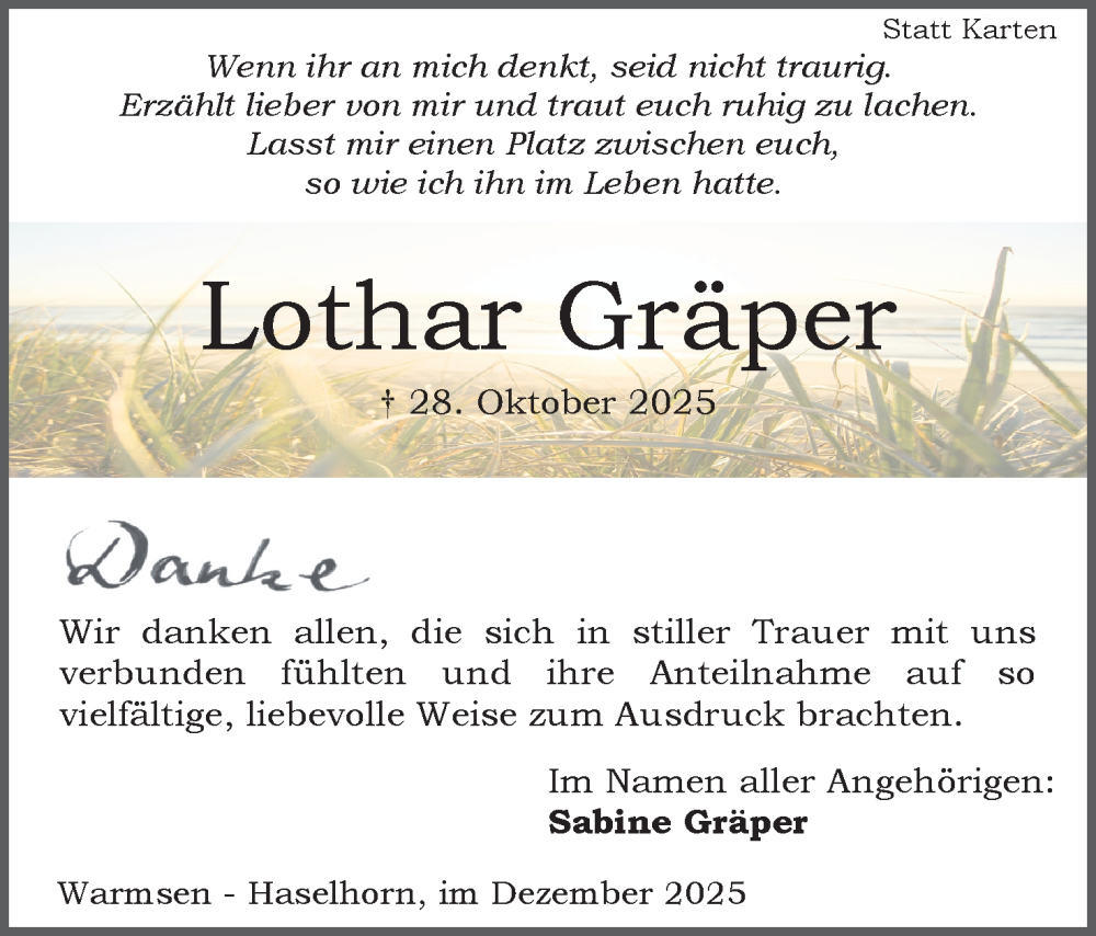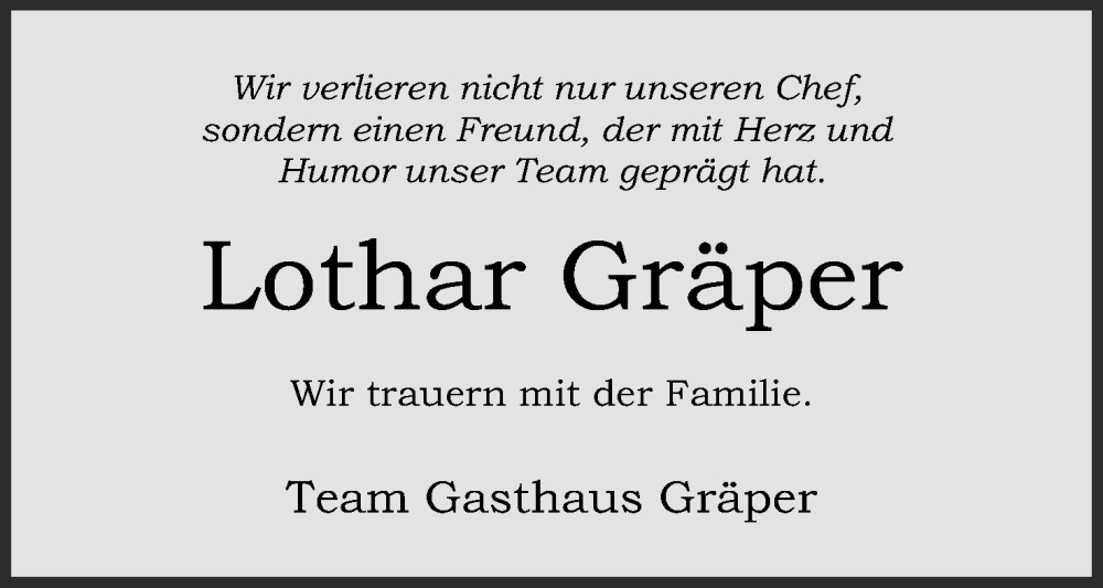 Hier finden Sie alle Traueranzeigen aus der Zeitung, die bisher für Lothar Gräper erschienen sind. Weitere Traueranzeigen, die in der Zeitung erscheinen, werden hier ebenfalls aufgelistet