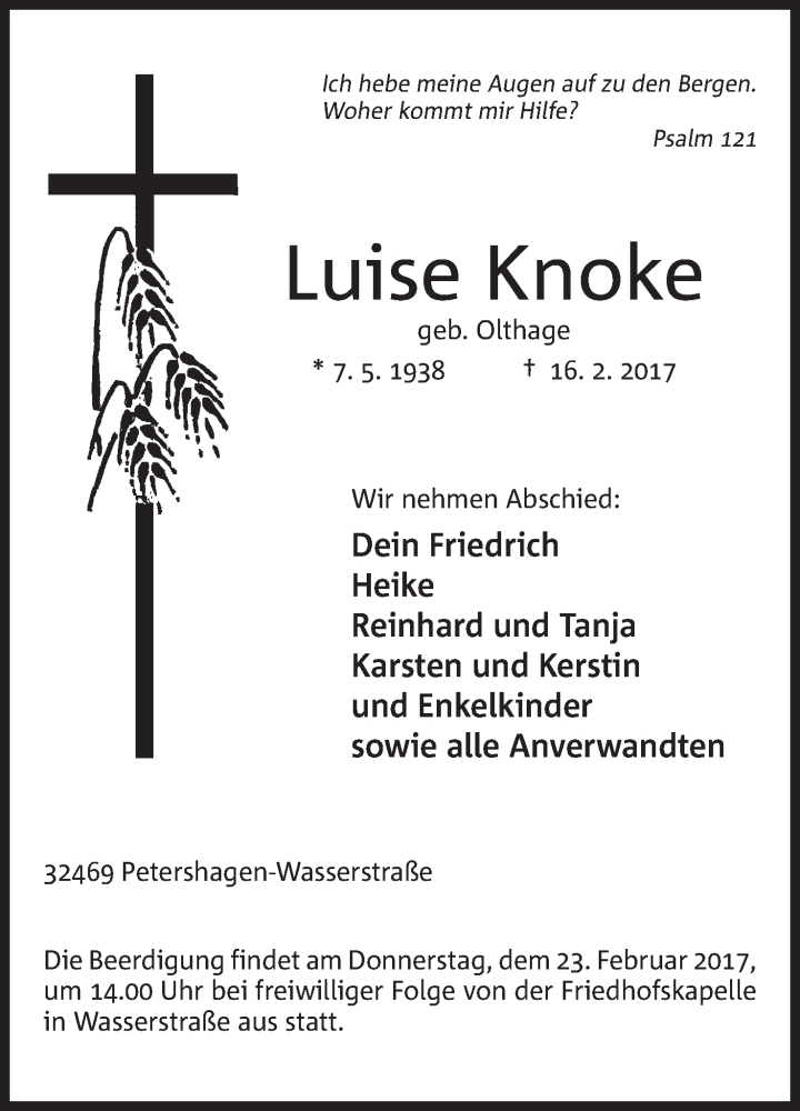Hier finden Sie alle Traueranzeigen aus der Zeitung, die bisher für Luise Knoke erschienen sind. Weitere Traueranzeigen, die in der Zeitung erscheinen, werden hier ebenfalls aufgelistet