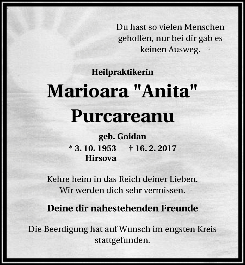 Hier finden Sie alle Traueranzeigen aus der Zeitung, die bisher für Marioara Purcareanu erschienen sind. Weitere Traueranzeigen, die in der Zeitung erscheinen, werden hier ebenfalls aufgelistet