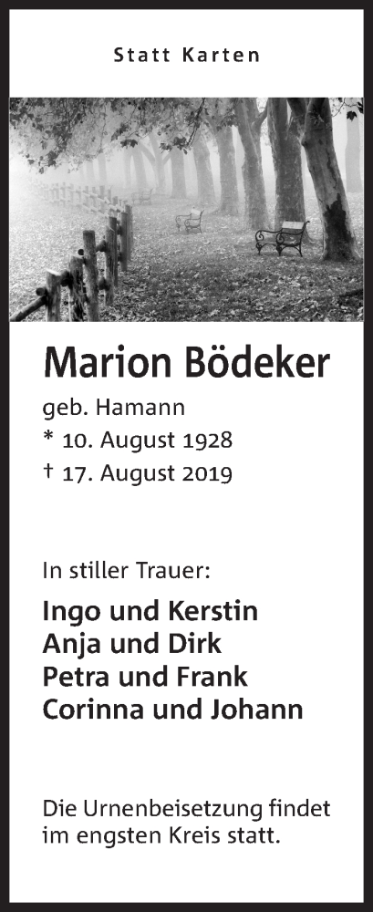 Hier finden Sie alle Traueranzeigen aus der Zeitung, die bisher für Marion Bödeker erschienen sind. Weitere Traueranzeigen, die in der Zeitung erscheinen, werden hier ebenfalls aufgelistet