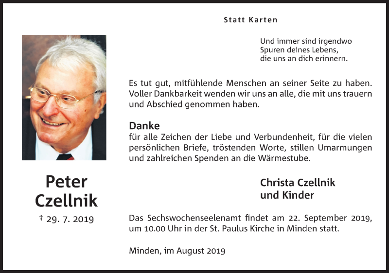 Hier finden Sie alle Traueranzeigen aus der Zeitung, die bisher für Peter Czellnik erschienen sind. Weitere Traueranzeigen, die in der Zeitung erscheinen, werden hier ebenfalls aufgelistet