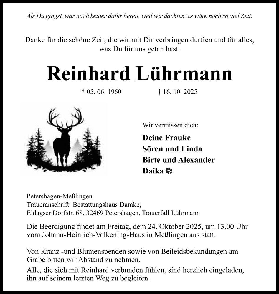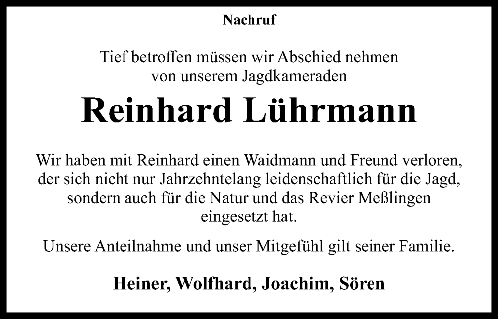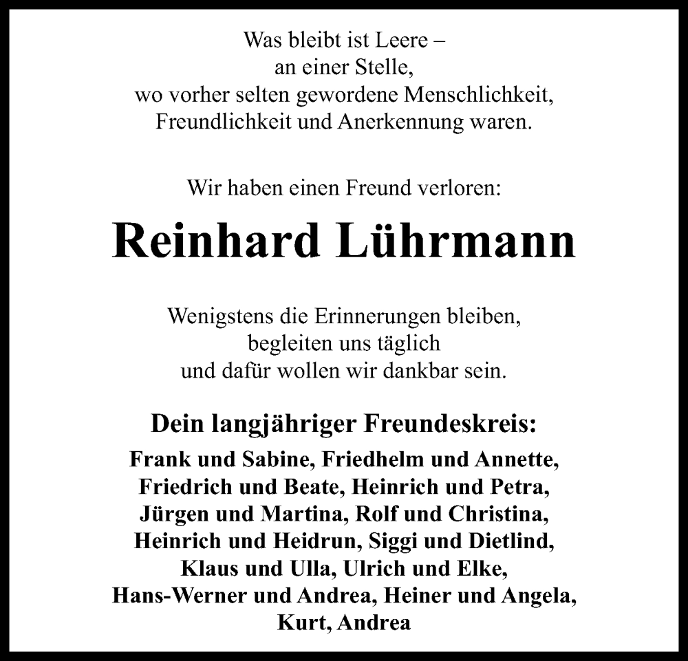 Hier finden Sie alle Traueranzeigen aus der Zeitung, die bisher für Reinhard Lührmann erschienen sind. Weitere Traueranzeigen, die in der Zeitung erscheinen, werden hier ebenfalls aufgelistet